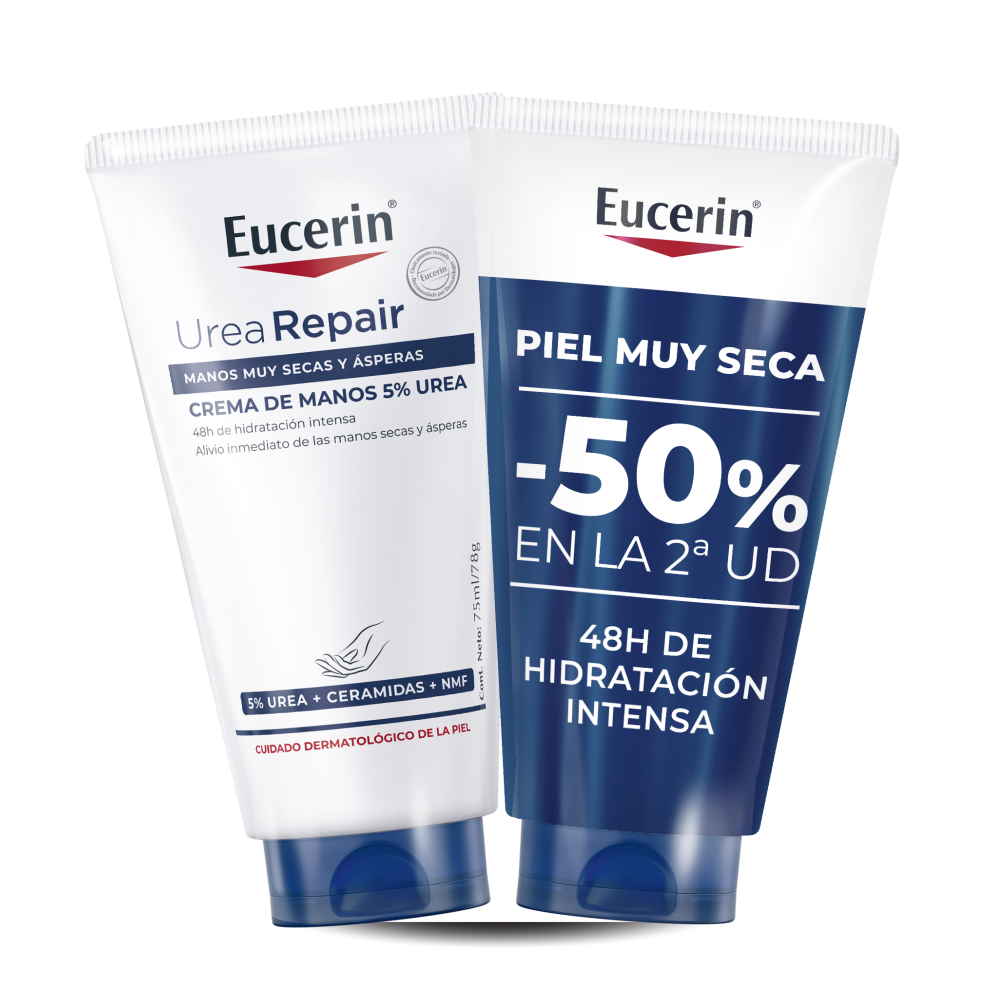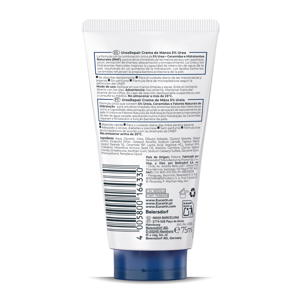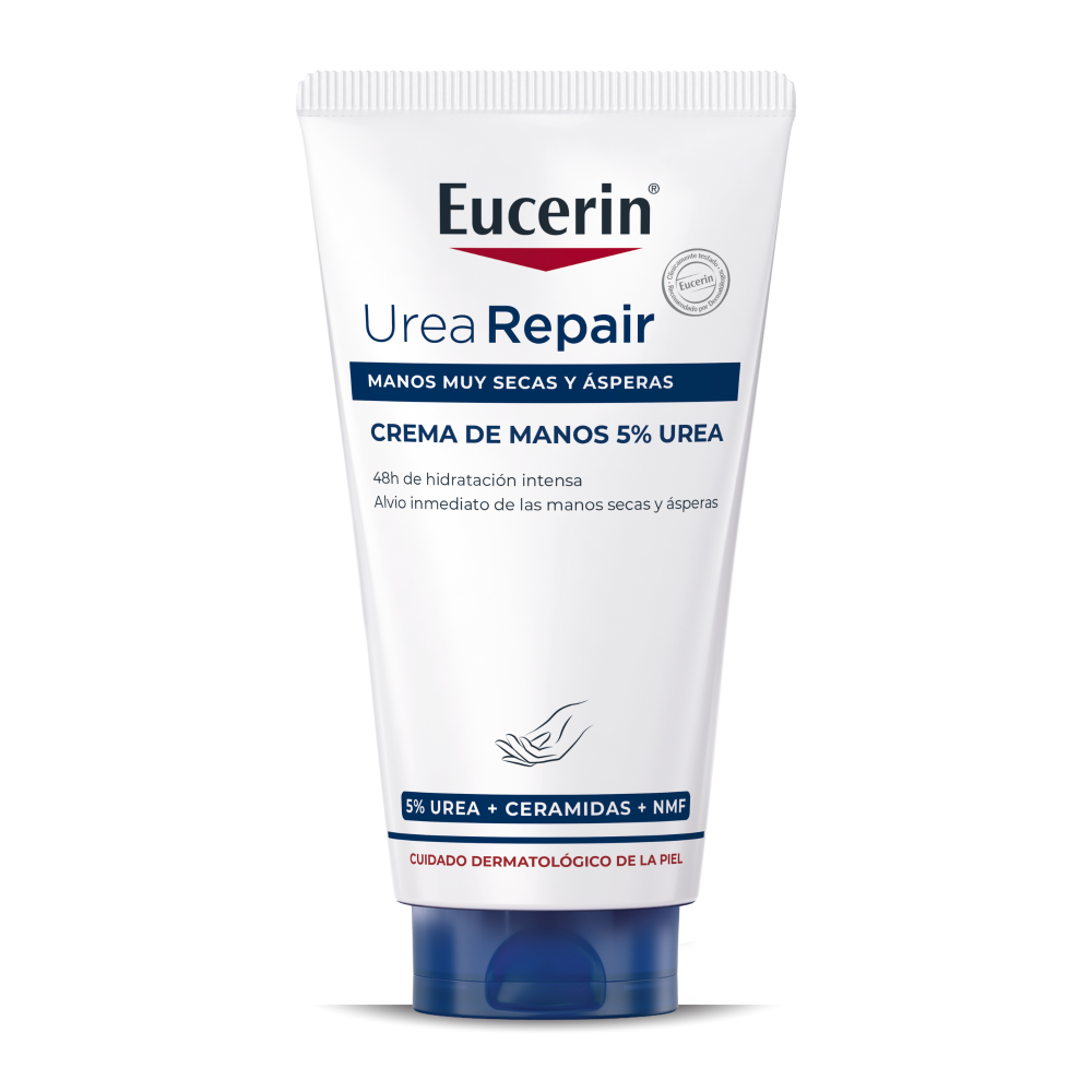Eucerin UreaRepair PLUS Crema de Manos 5% Urea contiene Urea, Ceramida y factores naturales de hidratación (NMF).