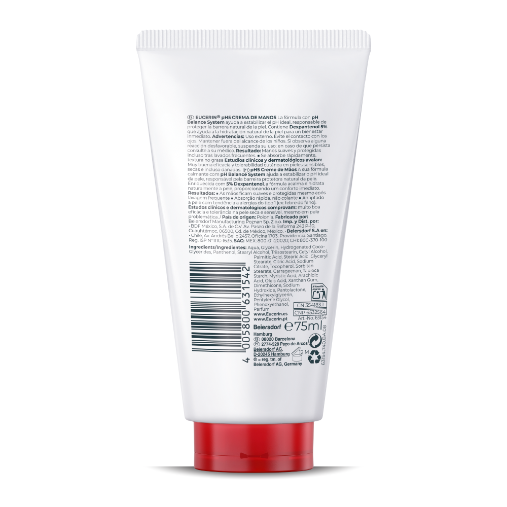 El lavado frecuente de las manos, los cambios de temperatura y la exposición a los elementos del medio son sólo algunas de las causas más usuales por las cuales las manos se vuelven sensibles y secas. Eucerin pH5 Skin-Protection Crema de manos se ha diseñado específicamente para contrarrestar estos agentes proporcionando 18 horas de protección frente a la deshidratación. Contiene dexpantenol, un complejo activo de eficacia clínicamente probada a la hora de estimular la regeneración de la piel y de fortalecer la barrera protectora natural todos los días.