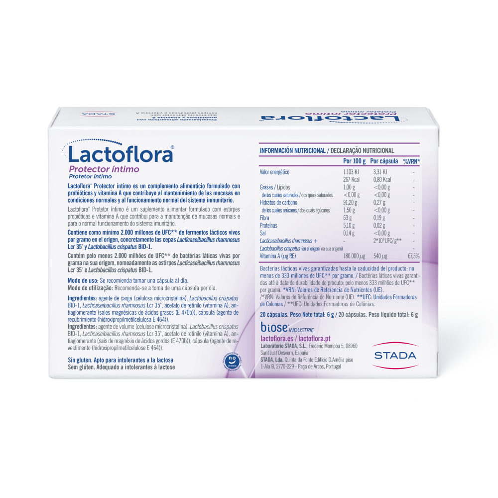 Lactoflora® protector íntimo está formulado con probióticos y vitamina A, que contribuye al mantenimiento de las mucosas en condiciones normales y contribuye al funcionamiento normal del sistema inmunitario también en la mucosa vaginal. Restablece y mantiene el bienestar íntimo de la mujer.