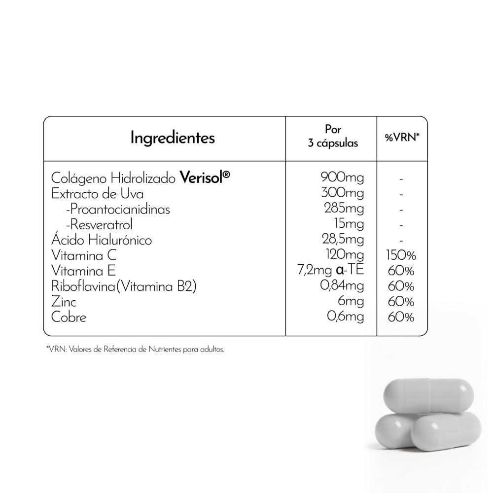 Colágeno Hidrolizado Verisol®, Acido Hialurónico, Resveratrol y un coctel de Vitaminas (C,E,B2) y Minerales (Zinc y Cobre).