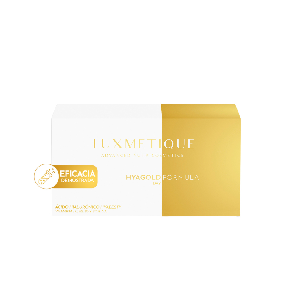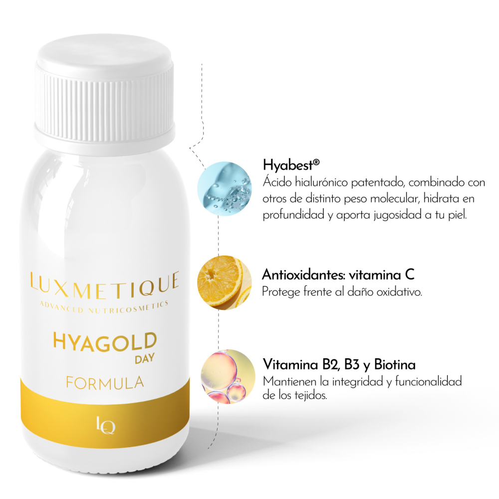 Luxmetique Hyagold day Formula - nutricosmético bebible, con la máxima concentración de ácido hialurónico de diferentes pesos moleculares destinado para para de pieles deshidratadas, castigadas, bolsas y ojeras, con beneficios a nivel ocular y articular. Descubre una nueva dimensión de cuidado con Luxmetique, donde la ciencia y la belleza se unen para ofrecerte resultados visibles y una vitalidad renovada. Su formato cómodo y de alta asimilación garantiza una experiencia de cuidado práctica y efectiva, integrándose perfectamente en tu rutina de bienestar.