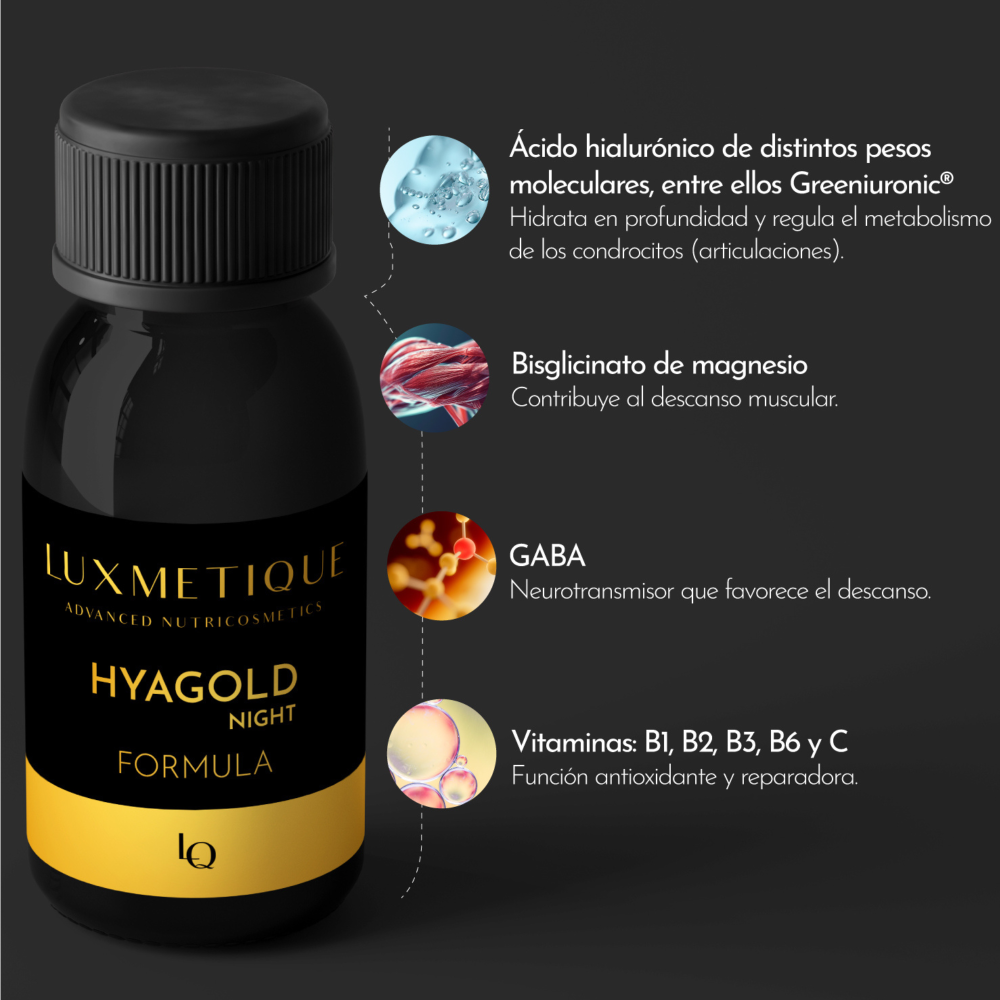 Luxmetique Hyagold Night Formula - nutricosmético bebible de toma nocturna a base de ácido hialurónico de diferentes pesos moleculares entre ellos Greeniuronic patente de eficacia demostrada, para conseguir hidratación en todas las capas de la piel así como efectos beneficiosos en el tratamiento de articulaciones. Además está enriquecida con adaptógenos, extractos calmantes e inductores del sueño y magnesio en forma de bisglicinato para mejorar el sueño y apoyar a la hidratación de nuestra piel así como evitar la pérdida de agua transepidérmica durante la noche. Descubre una nueva dimensión de cuidado con Luxmetique, donde la ciencia y la belleza se unen para ofrecerte resultados visibles y una vitalidad renovada. Su formato cómodo y de alta asimilación garantiza una experiencia de cuidado práctica y efectiva, integrándose perfectamente en tu rutina de bienestar.