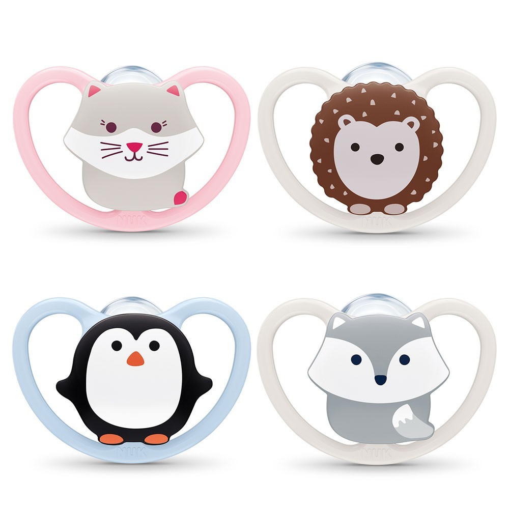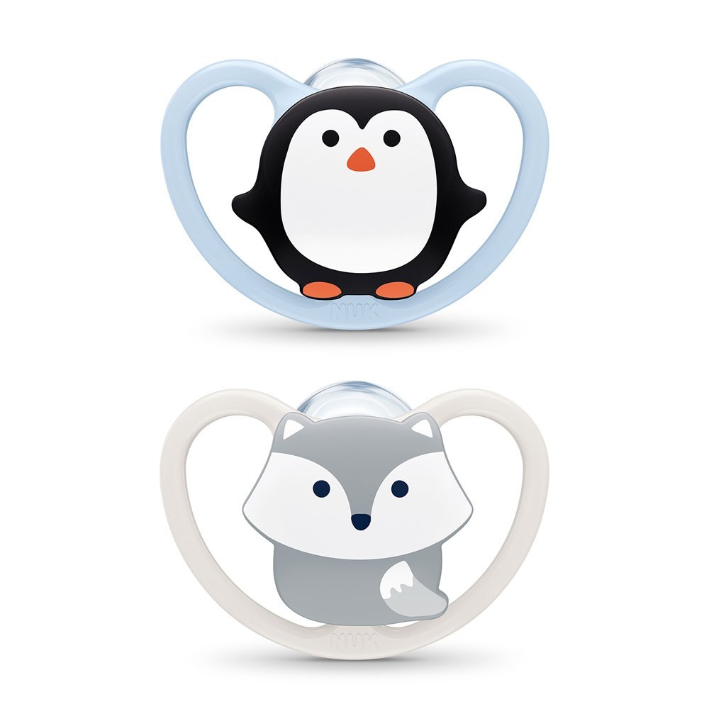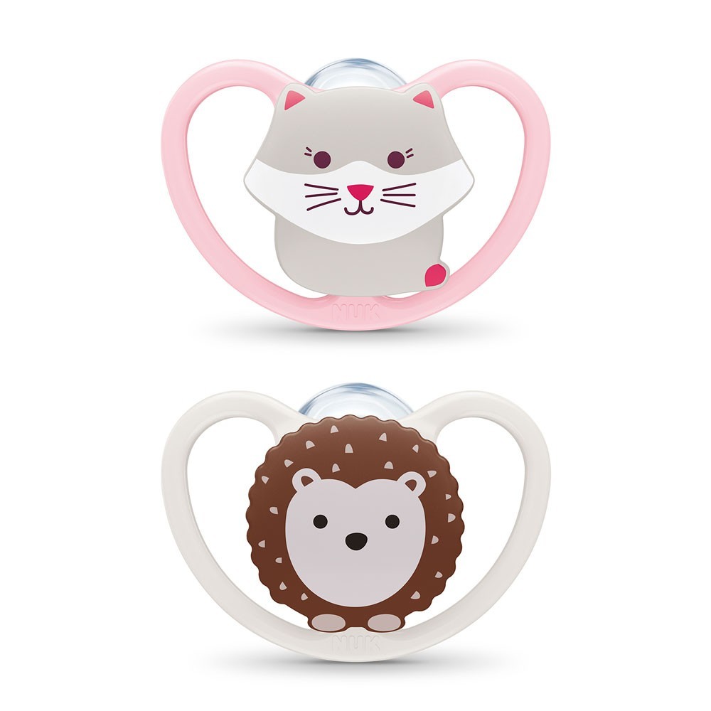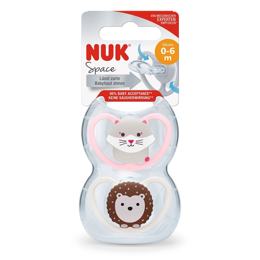 Nuk Chupete Space 0-6 Silicona 2 unidades para bebés de 0 a 6 meses. Escudo abierto para minimizar los puntos de contacto con la piel.