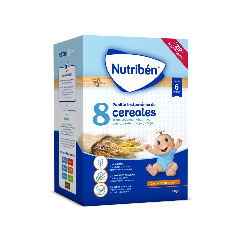 La papilla Nutribén® 8 Cereales, tiene un mayor porcentaje de cereales: los cereales son una importante fuente de energía y por eso son un alimento básico en la dieta infantil. Compuesto por 8 cereales: trigo, cebada, maíz, arroz, avena, centeno, mijo y sorgo.