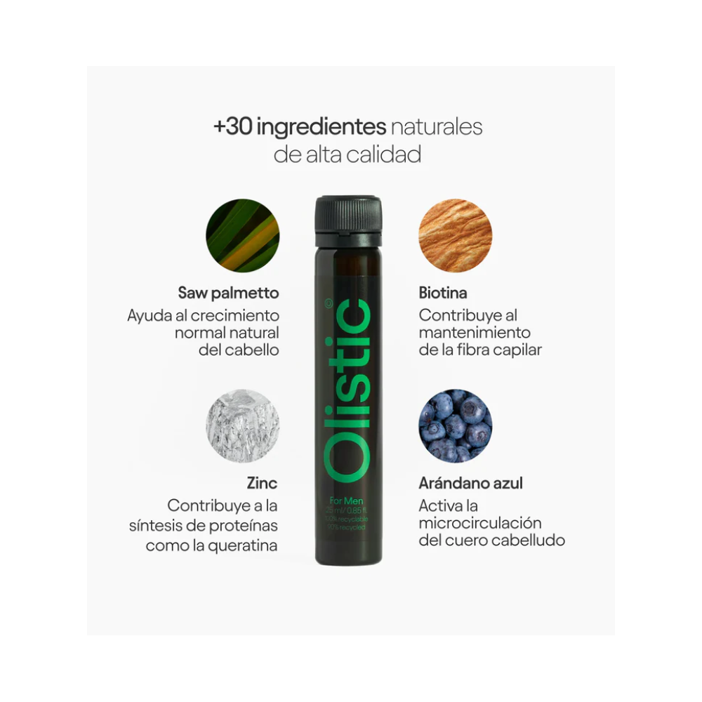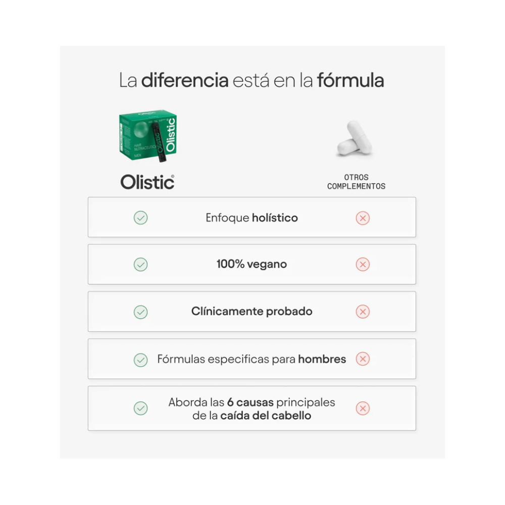 Olistic For Men y For Women son la primera fórmula proporciona una respuesta eficaz y sinérgica a las 6 causas fundamentales que afectan la caída del cabello de los hombres y las mujeres que son la predisposición genética, el estrés, los déficits nutricionales, la microinflamación, los factores ambientales y el envejecimiento.