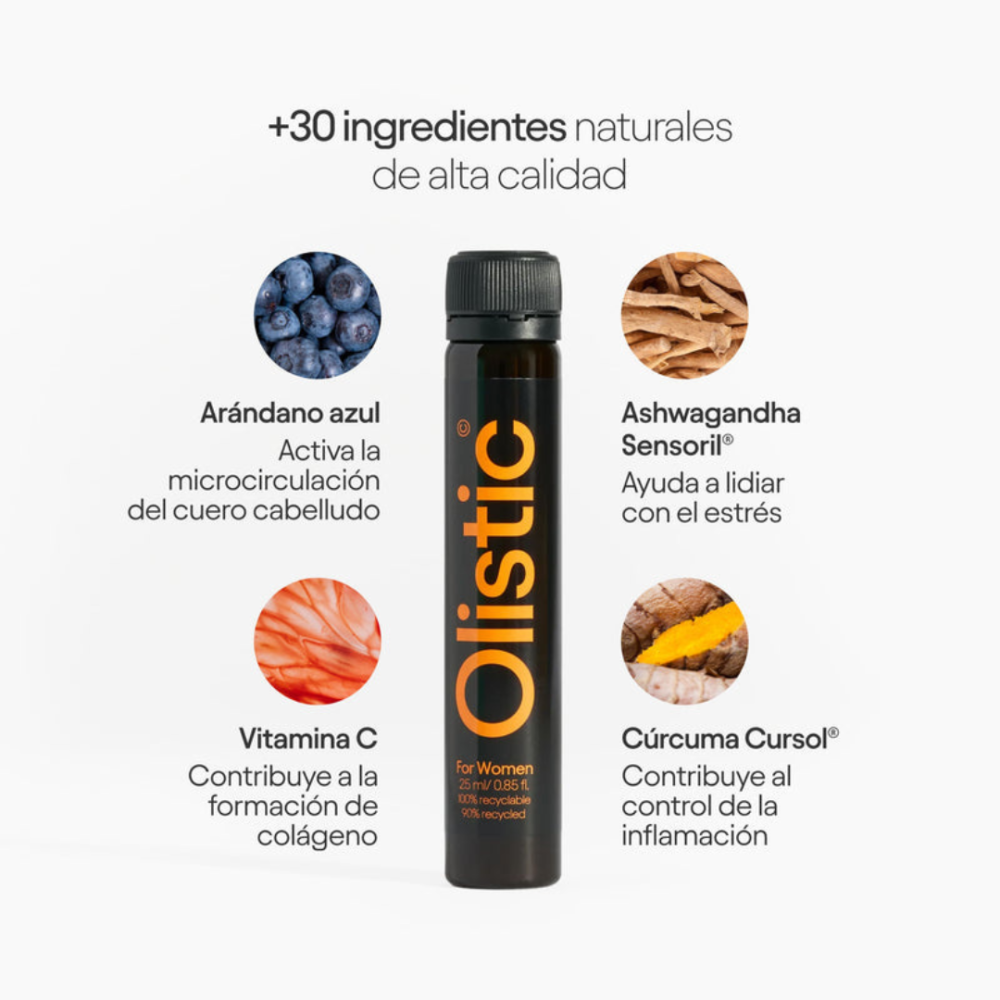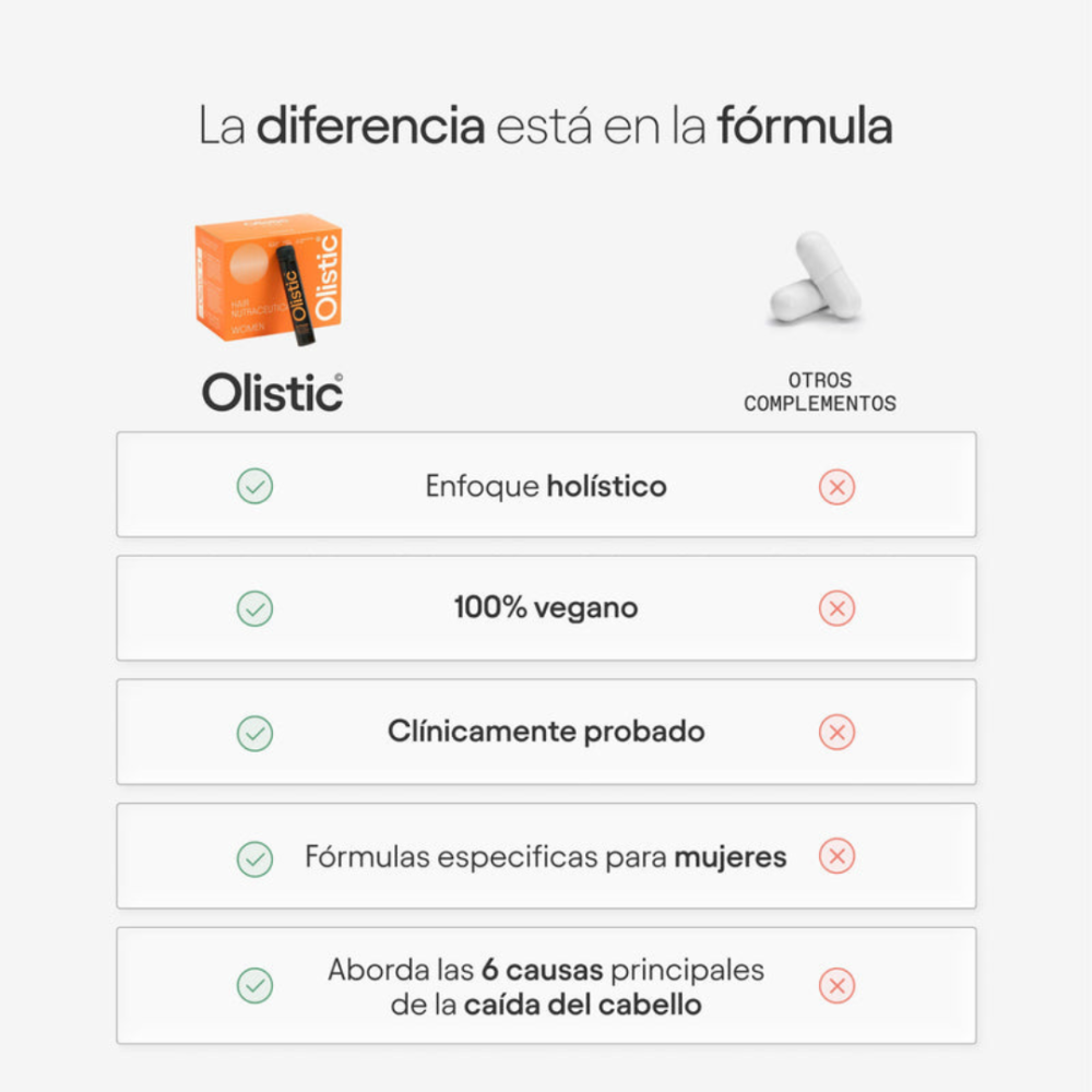 Olistic For Men y For Women son la primera fórmula proporciona una respuesta eficaz y sinérgica a las 6 causas fundamentales que afectan la caída del cabello de los hombres y las mujeres que son la predisposición genética, el estrés, los déficits nutricionales, la microinflamación, los factores ambientales y el envejecimiento.