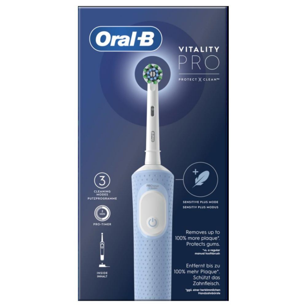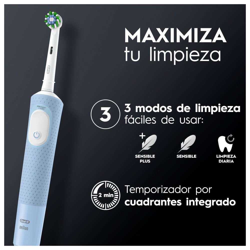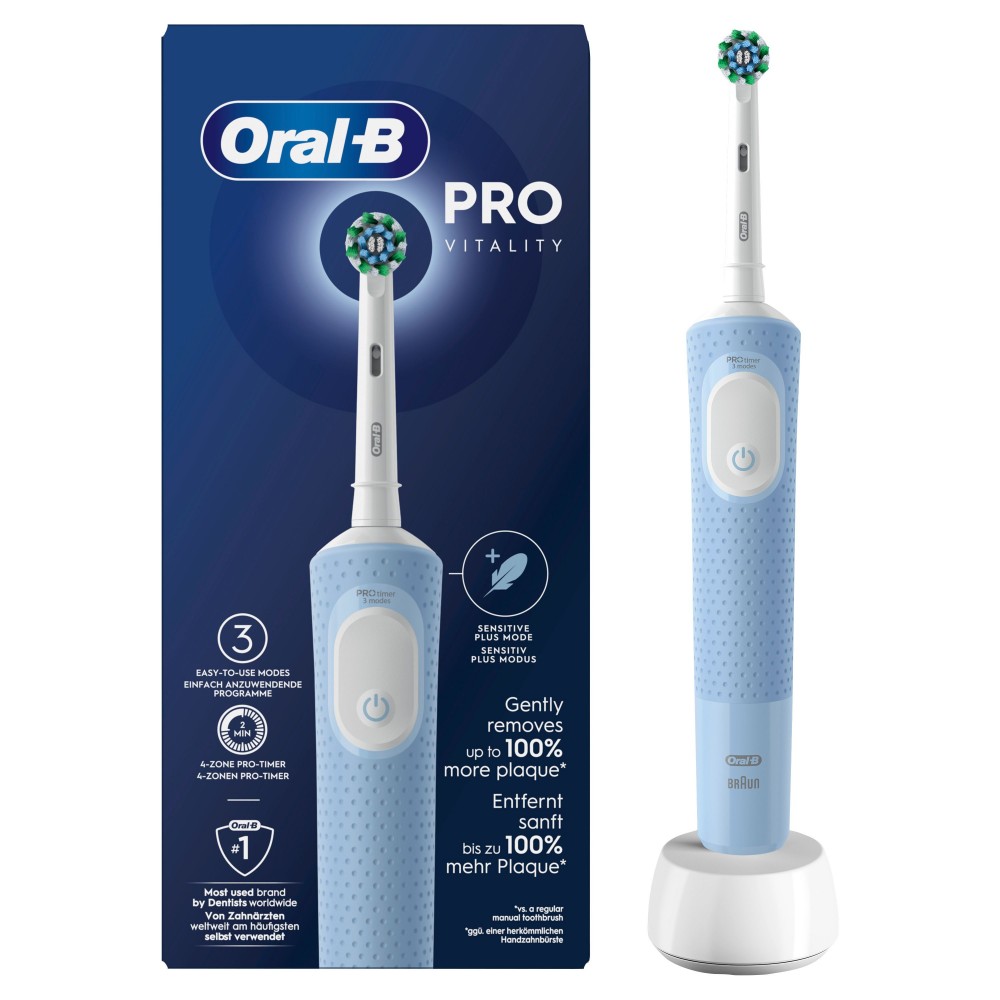 El cepillo de dientes eléctrico recargable Oral-B Vitality 100 CrossAction ofrece una limpieza clínicamente probada más intensa, en comparación con un cepillo de dientes manual normal.