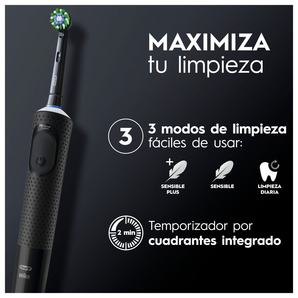 El cepillo de dientes eléctrico recargable Oral-B Vitality 100 CrossAction ofrece una limpieza clínicamente probada más intensa, en comparación con un cepillo de dientes manual normal.