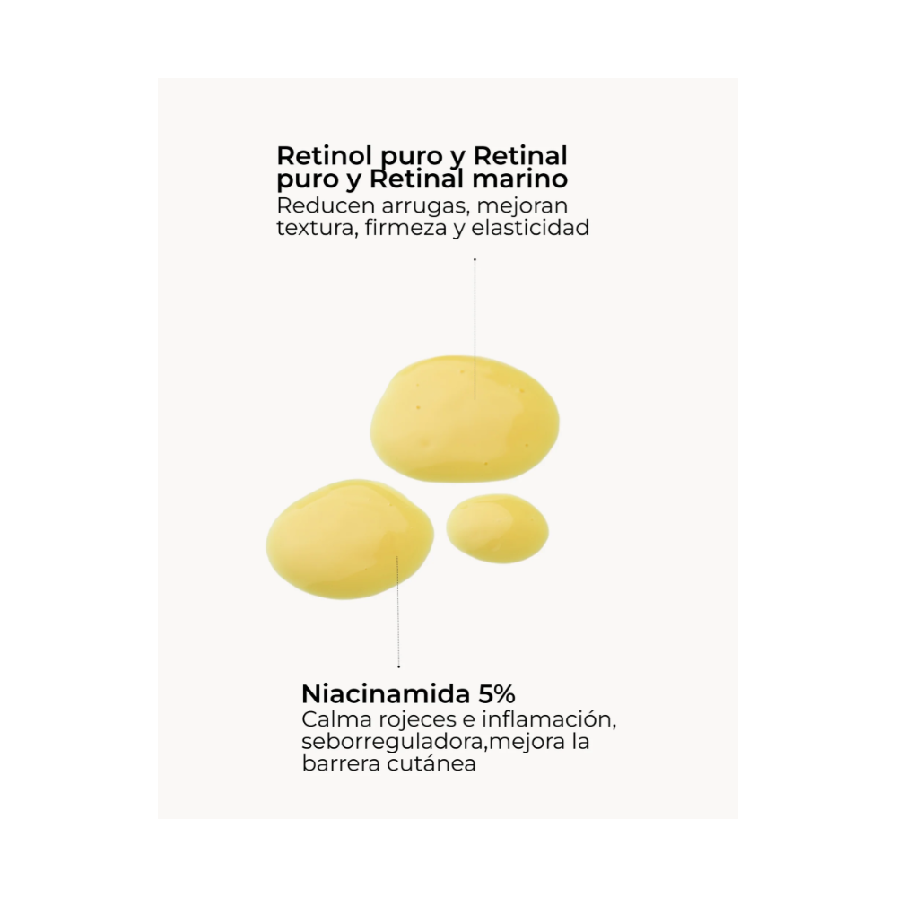 Sérum de noche de alta potencia con una combinación sinérgica de retinol puro, retinal y retinal marino, que acelera la renovación celular y mejora visiblemente la calidad de la piel.