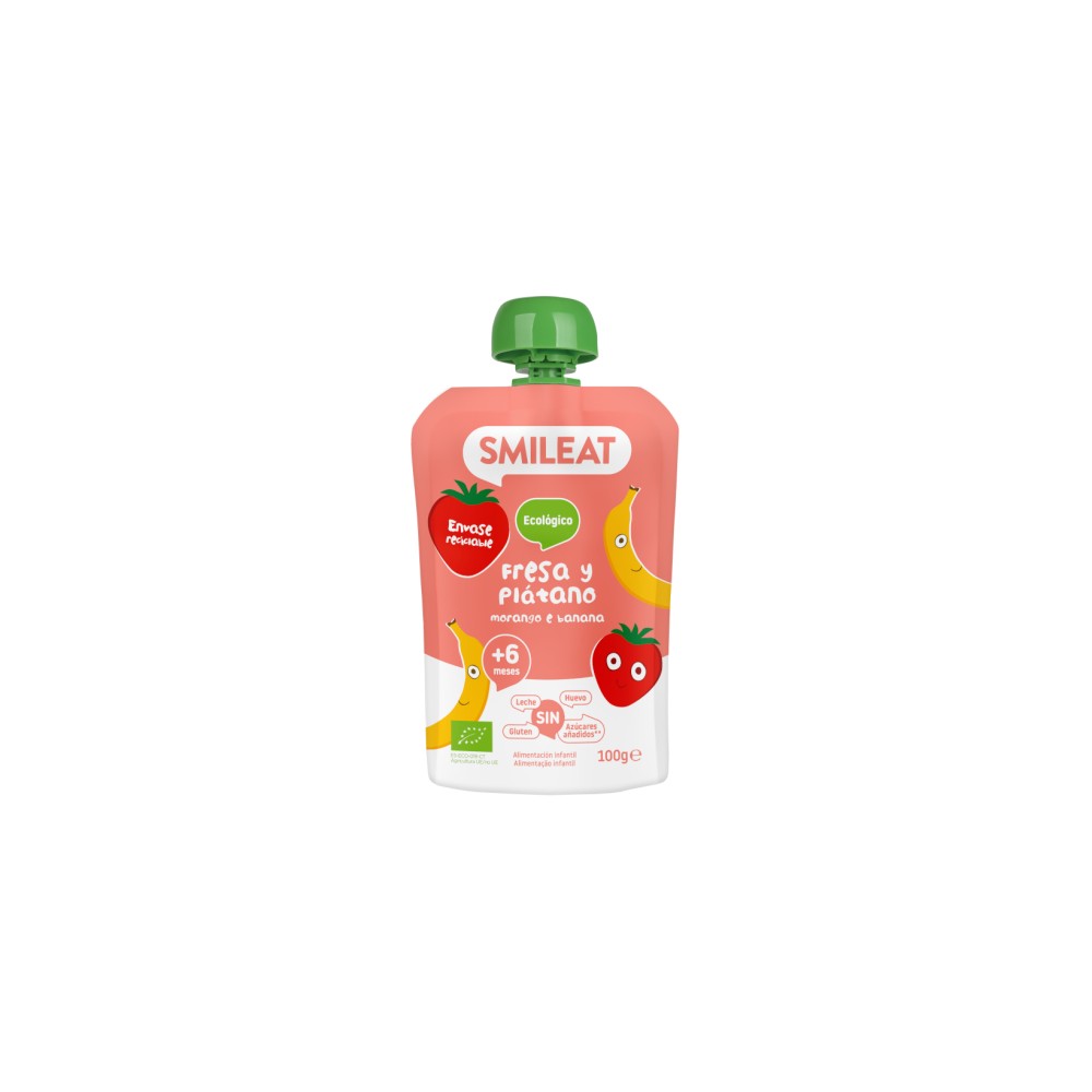 Smileat Pouch de Fresa y Plátano Ecológico es una solución nutricional avanzada diseñada para bebés a partir de los seis meses que buscan descubrir sabores frescos y naturales.