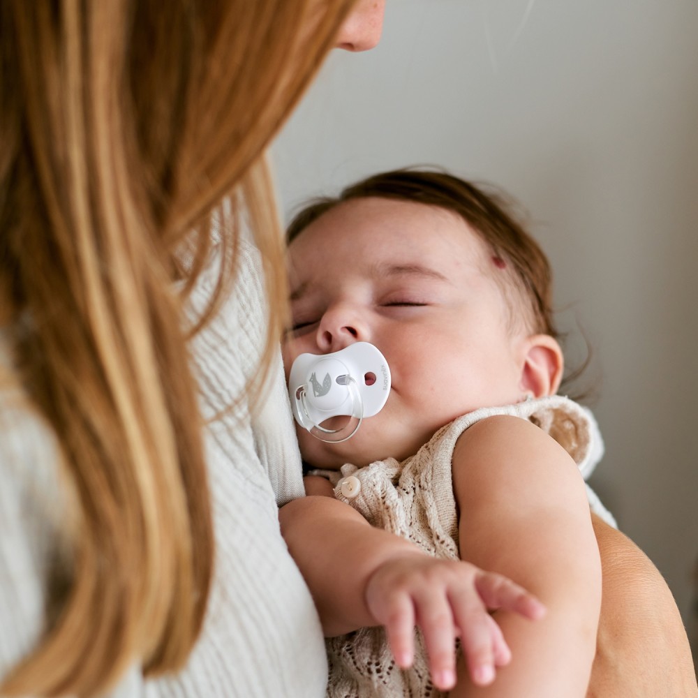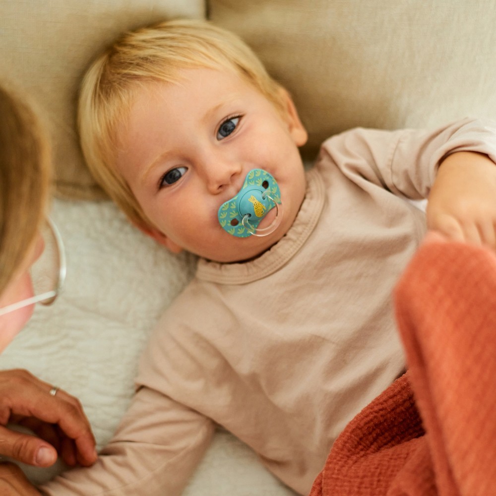 Chupetes con tetina fisiológica de silicona que respetan el desarrollo bucodental del bebé.