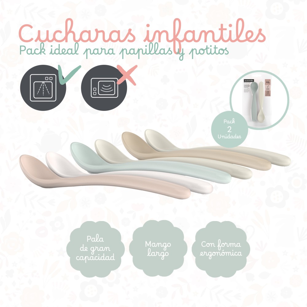 El tamaño de su mango y su forma curva y redondeada, garantizan la seguridad y comodidad de uso para el bebé y la mamá, facilitando su manejo tanto cuando come solito como cuando se le da de comer. Cucharas para bebés disponibles en azul, rosa y verde.