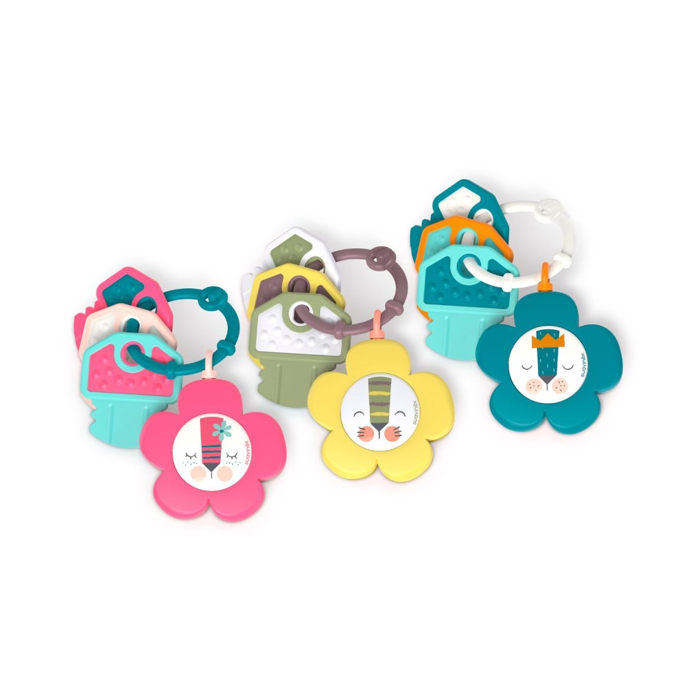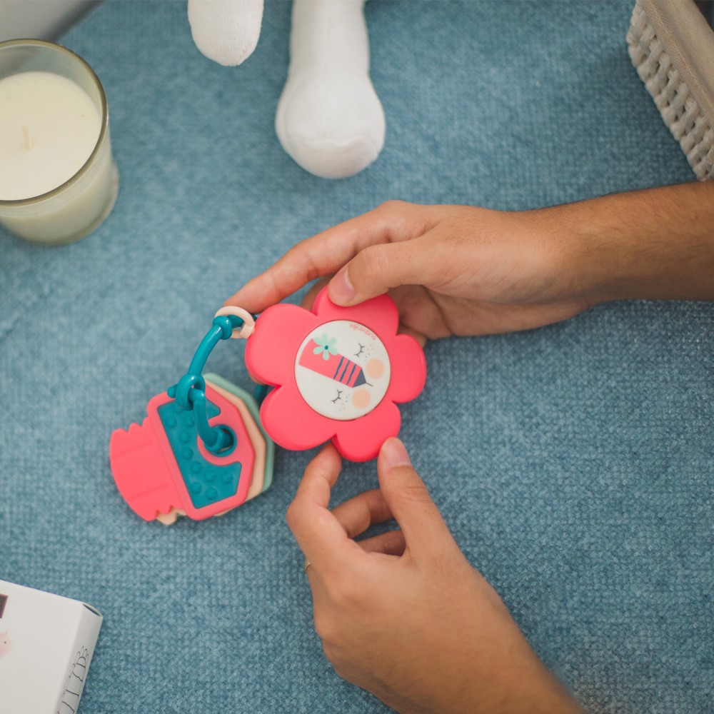 La parte superior de las llaves está hecha con un plástico firme y suave que permite ejercitar las encías en el momento de salir los dientes y la suave textura de la parte inferior de las llaves promueve el desarrollo de dientes fuertes y sanos. Además, el botón de la estrella musical activa una agradable y relajante melodía. Disponible en azul, rosa y verde.