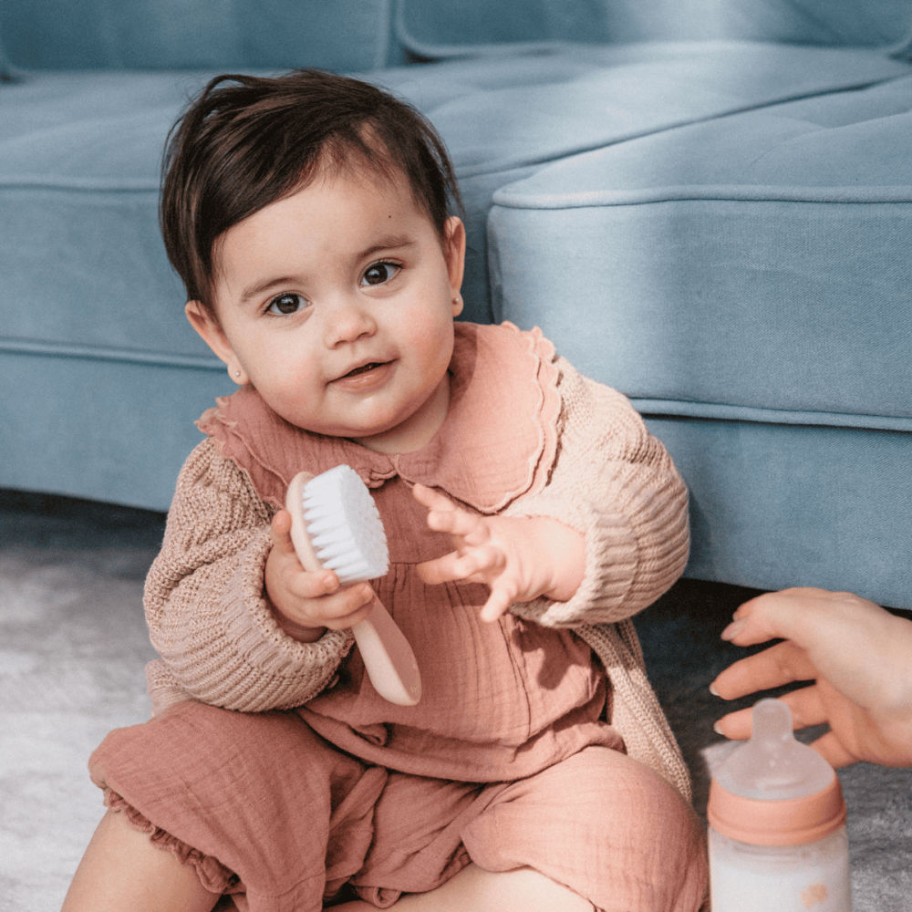 El set cepillo-peine es ideal para el cuidado diario del bebé. Tanto el cepillo como el peine no tienen cantos vivos ni aristas peligrosas que puedan dañar al bebé. Las púas del peine tienen los extremos redondeados, y las fibras del cepillo tienen la suavidad y flexibilidad idónea para los cabellos del bebé. Viene decorado con divertidos dibujos de pajaritos. Disponible en azul, rosa y blanco.