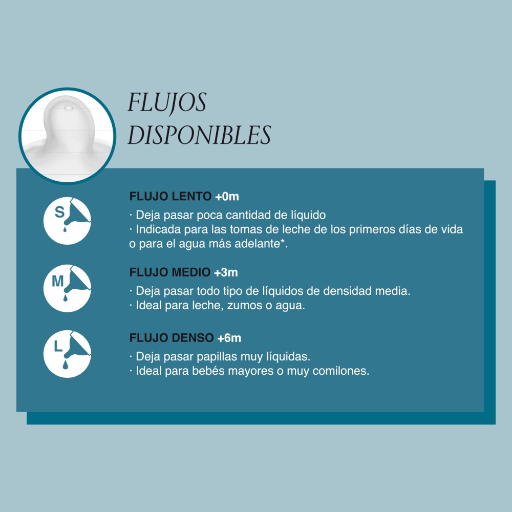 Silicona fina ultra-suave con acabado arenado, imita en textura y consistencia el pezón materno, consiguiendo: máxima calidez, movimiento super flexible y una adaptación máxima a la forma del paladar.