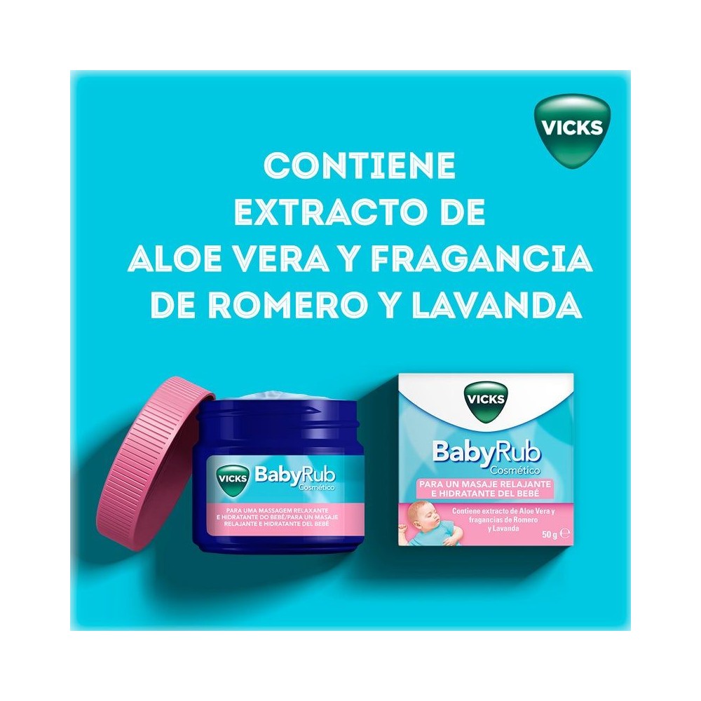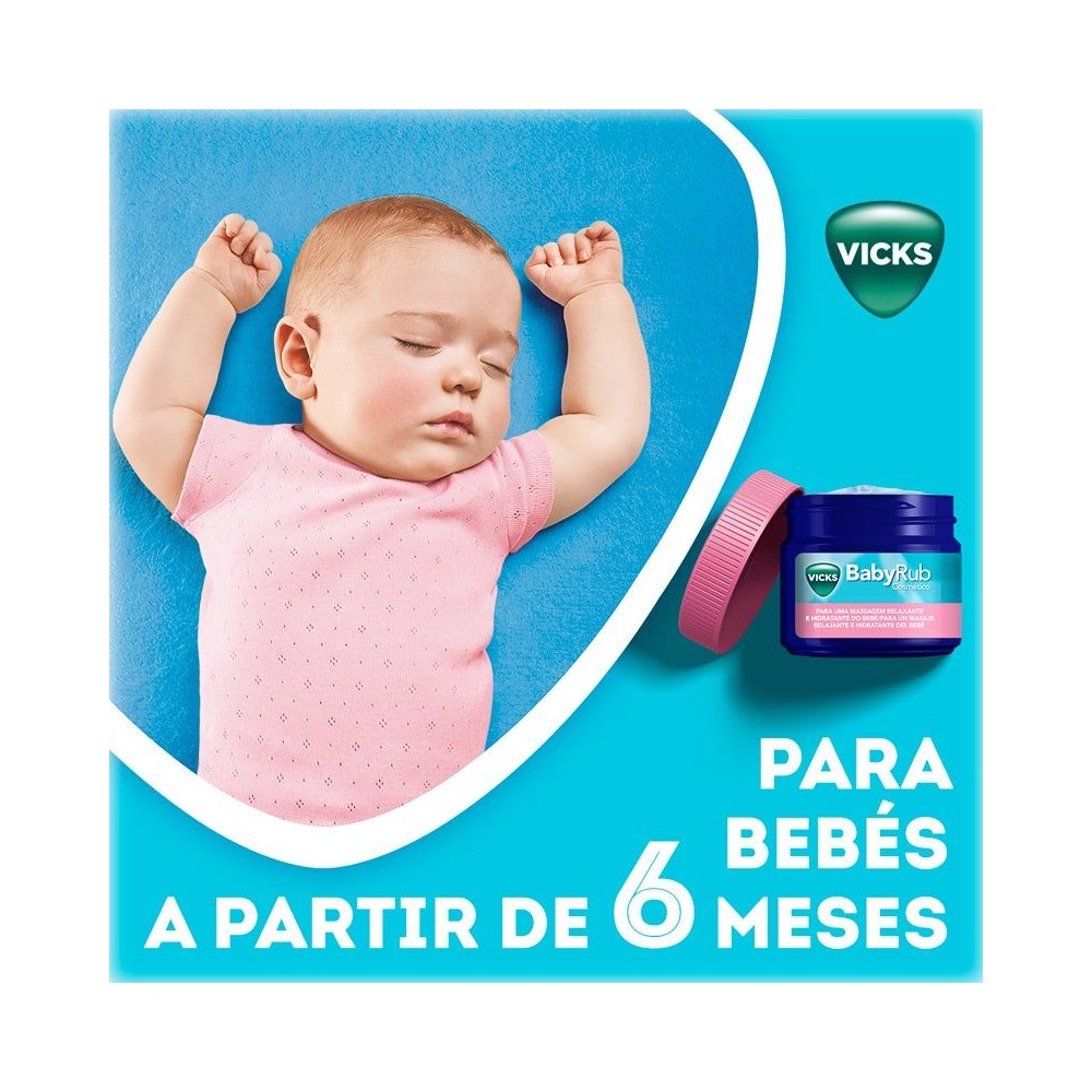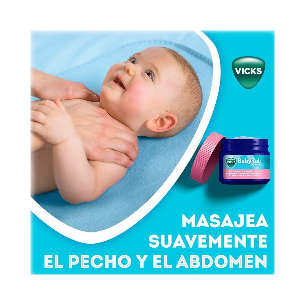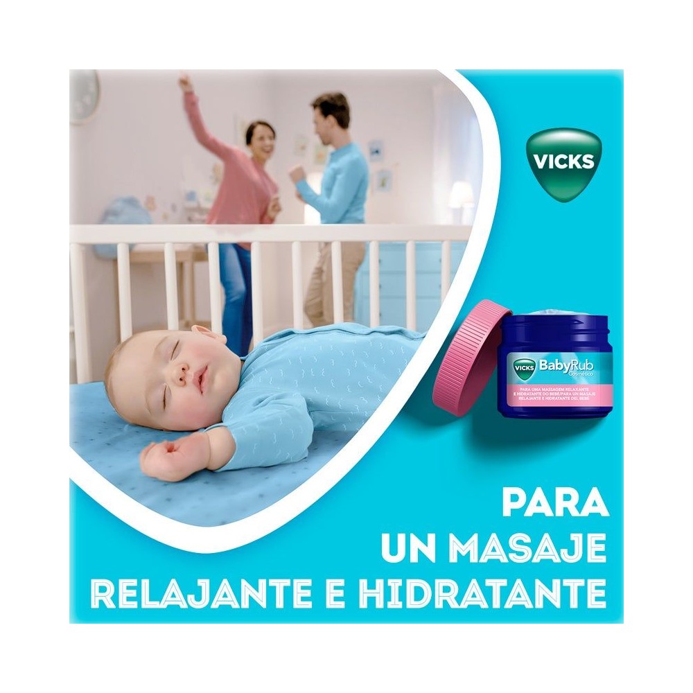 Vicks® BabyRub™ es una fórmula sin medicación que contiene fragancias de eucalipto, romero y lavanda. Combinado con el amor de tus caricias, es perfecto para calmar, aliviar y relajar a tu bebé.