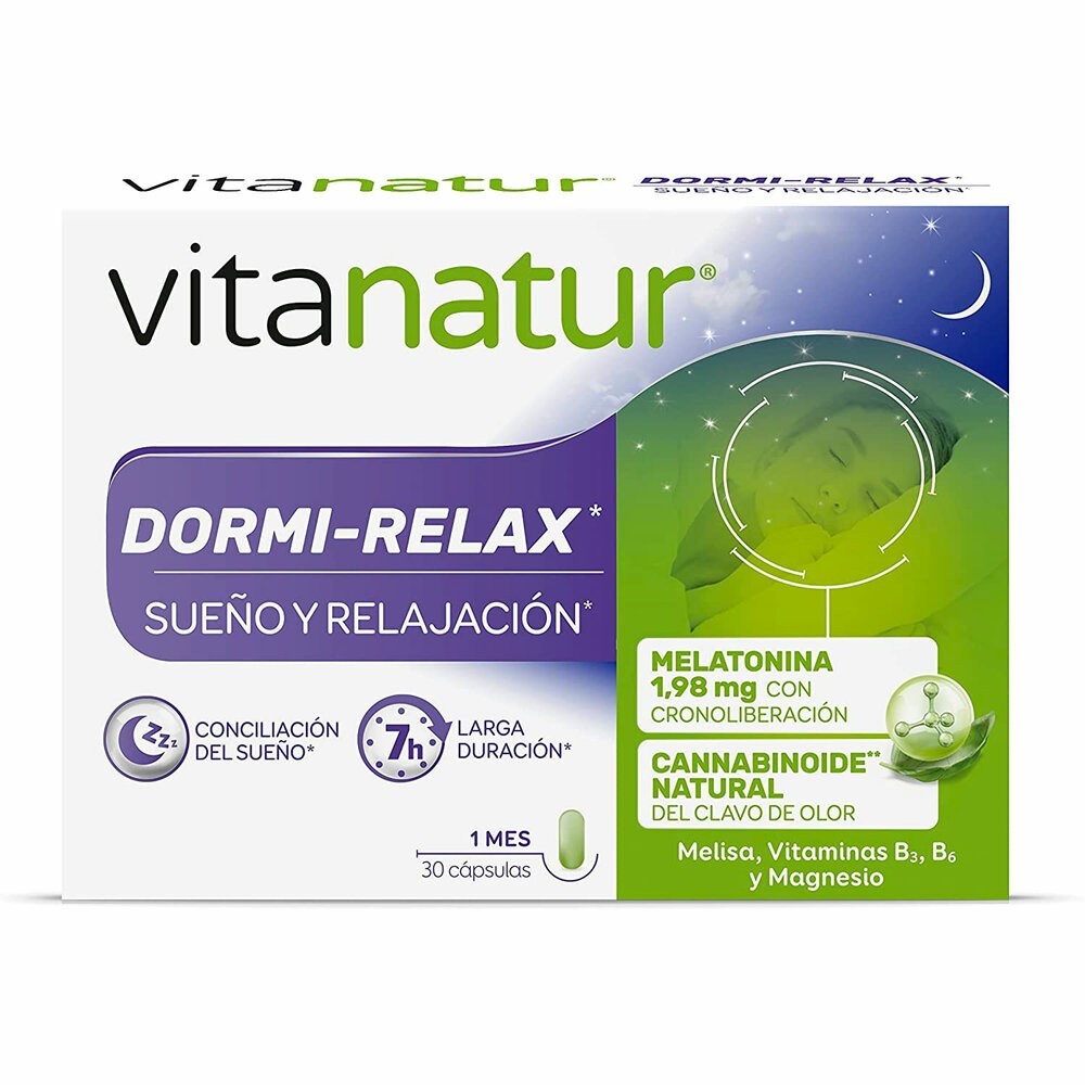 Melatonina: contribuye a disminuir el tiempo necesario para conciliar el sueño. El efecto beneficioso se obtiene con una ingesta de 1 mg de melatonina antes de irse a dormir. Vitanatur Dormi-relax proporciona 1,98mg de melatonina con una primera fase de liberación rápida seguida de una liberación sostenida que asegura el mantenimiento de melatonina durante toda la noche (7-8h).