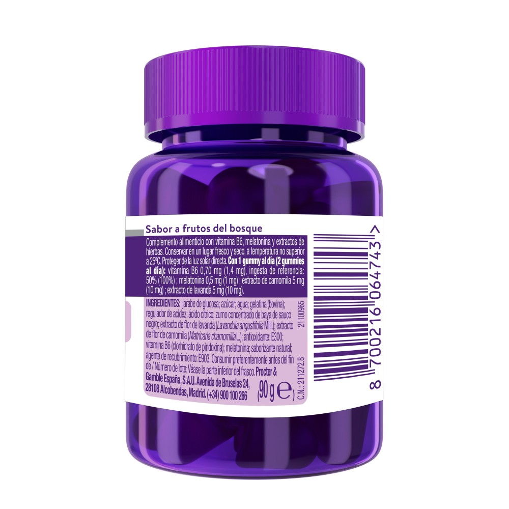 Jarabe De Glucosa; Azúcar; Agua; Gelatina (Bovina); Regulador De Acidez: Ácido Cítrico (E330); Zumo Concentrado De Baya De Sauco Negro; Saborizante Natural; Extracto De Flor De Lavandula Angustifolia; Extracto De Flor De Matricaria Chamomilla; Antioxidante: Ácido Ascórbico (E300); Agente De Recubrimiento: Cera De Carnauba (E903); Maltodextrina; Vitamina B6 (Clorhidrato De Piridoxina); Melatonina. Con 1 Gummy Al Día (2 Gummies Al Día): Vitamina B6 0,70 mg (1,4 mg), Ingesta De Referencia: 50% (100%); Melatonina 0,5 mg (1 mg); Extracto De Camomila 5 mg (10 mg); Extracto De Lavanda 5 mg (10 mg)